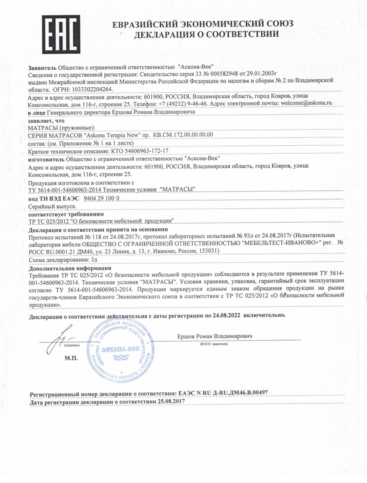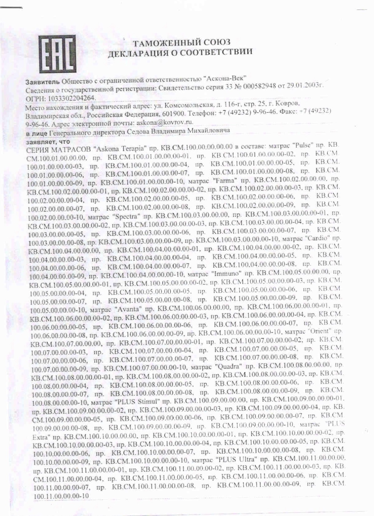 У меня положительное мнение о матрасе Аскона Terapia который недавно приобрела, спать на нем удобно, комфортно, матрас качественный и стоимость при этом его адекватная. Перед тем как приобрести матрас данной марки рассматривала множество вариантов и этот меня устроил своими свойствами. Размер брала 90 на 200, матрас имеет 5 зон комфорта. На старом матрасе, до покупки этого не могла выспаться, здесь же спать одно удовольствие.